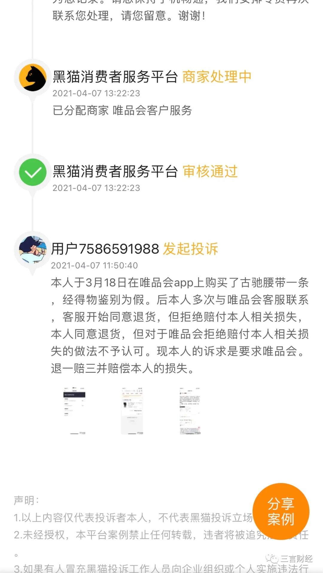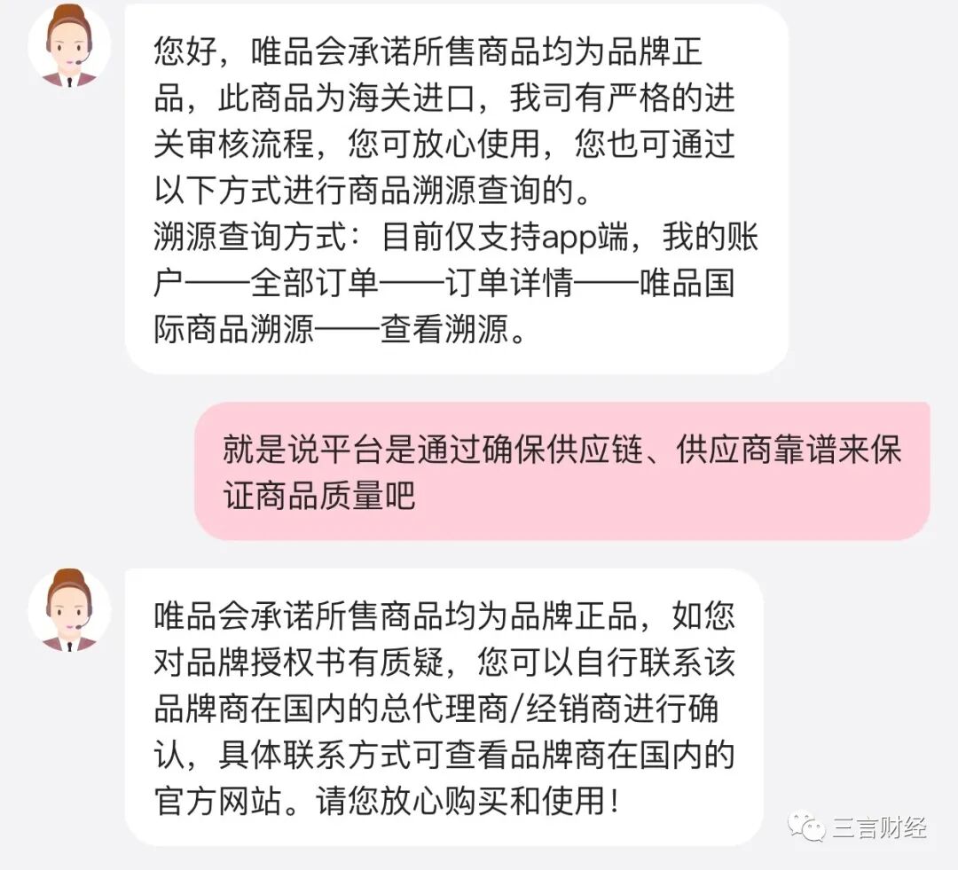 三言财经就相关问题咨询唯品会客服,但对方对平台所售商品质量问题均只回应称“唯品会承诺所售商品均为品牌正品”。