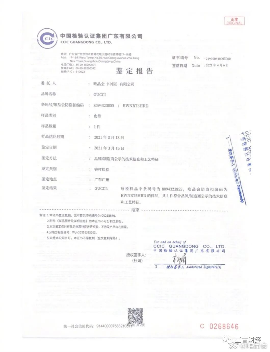 唯品会附上了一系列中检集团广东公司出具的鉴定报告和产品采购链条相关证明。根据该报告,这批于3月7日送检的Gucci腰带抽检结果为“符合”。此外,唯品会方面还表示将再次委托中检集团鉴定,以打消消费者顾虑。