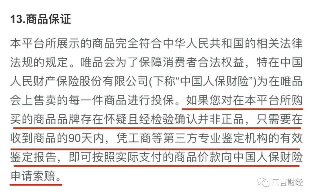这段协议可以理解为,如果消费者认为买到假冒商品,那么不仅需要自己送检,而且是向唯品会投保的保险公司索赔。