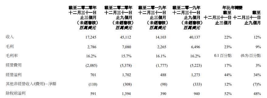 2021年2月3日,联想集团(00992.HK)披露2020/21年财政年度第三季业绩,截至2020年12月31日止的三个月,联想集团实现收入172.45亿美元,同比增长22%。