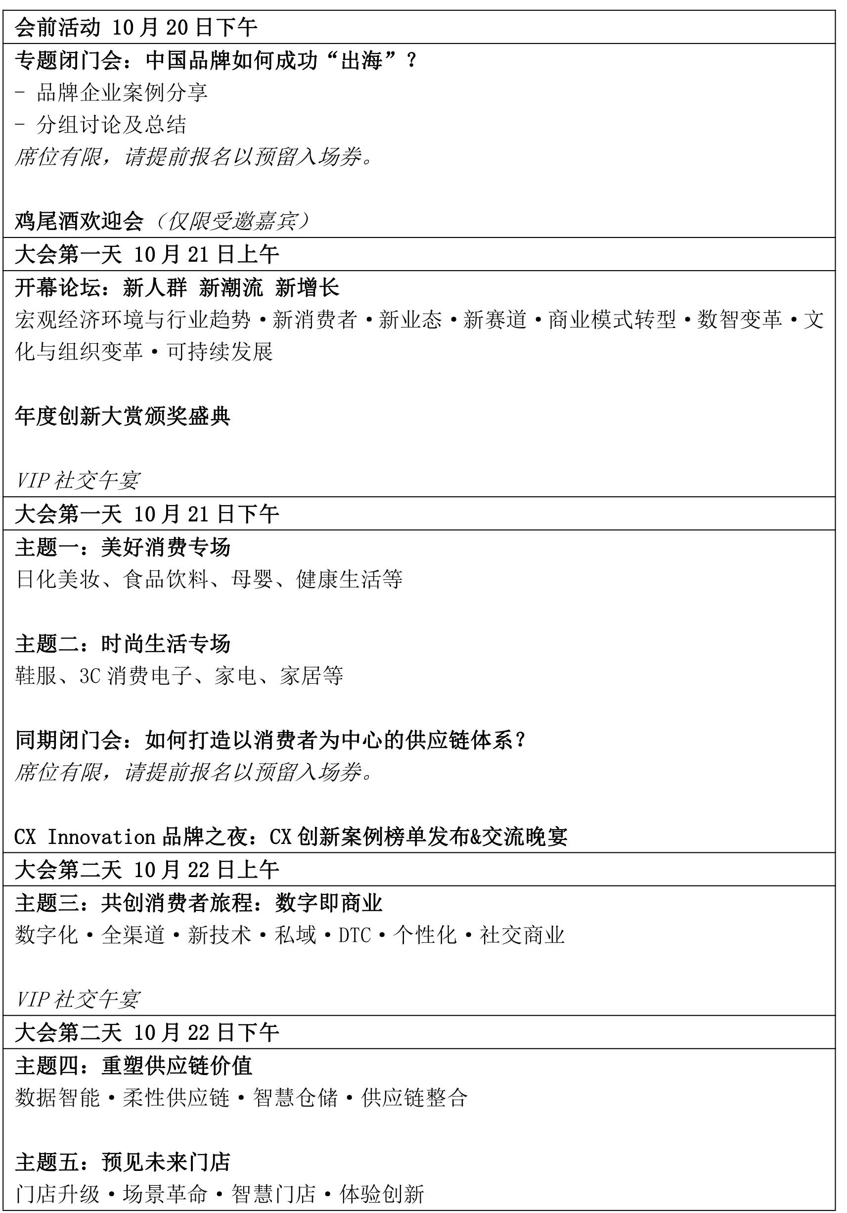 三天峰会围绕“消费者体验”展开,涵盖6大主题论坛、2场圆桌对话、1场会前专题闭门会、1场同期高层闭门会、CX Innovation品牌之夜交流晚宴&榜单发布、年度创新大赏颁奖盛典以及展区创新工场等多项活动,以期为您创造多样化且有价值的学习平台与社交场合。