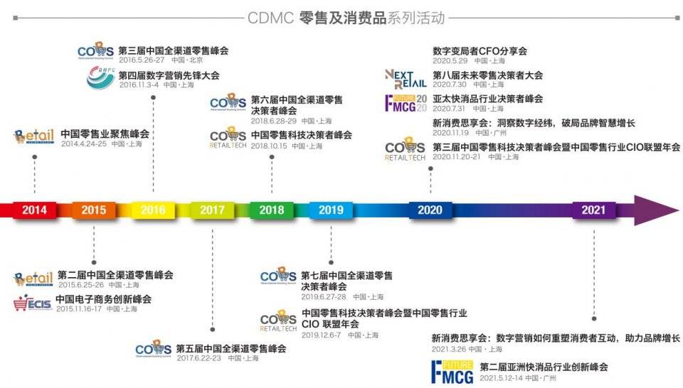 CDMC零售及消费品系列活动举办至今已有8年历史,涉足电商、数字营销、全渠道零售、快消品、零售科技等多个领域,孵化了CORS、RetailTech、NextRetail、Future FMCG、新消费、CX Innovation等品牌活动。“CORS全渠道”是决策者零售研究院从2014年延续至今的品牌,但在“零售即全渠道”的当下,年轻消费群体强劲崛起,消费与渠道多元碎片化,不同消费理念、消费方式不断涌现,消费者愈加强势并占据主导,我们意识到是时候改变了。
